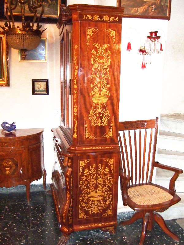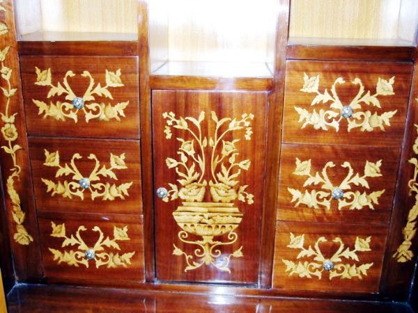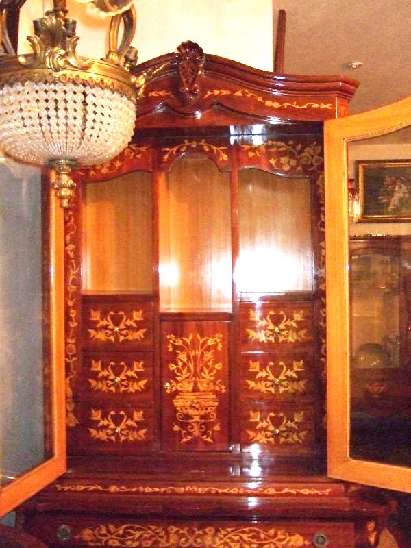 Elegant Chippendale style bookcase with skillful beautiful marquetry patterns with six medium size drawers inside the two glass doors and large four drawers beneath.