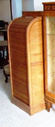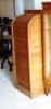 English Style Tambour Rolling door secretary / filing cabinet ending with round top and wooden sliding shelves inside.