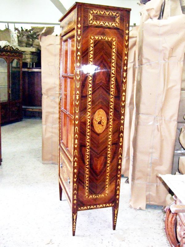 Italian style Bookcase inlaid with extensive marquetry patterns and beautiful veneer inlays, with two shelves & deep drawer.