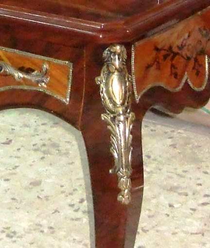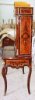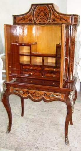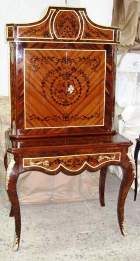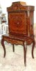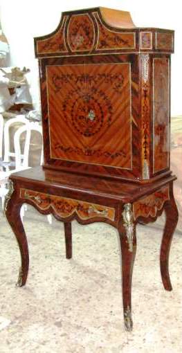 Ormolu mounted French Louis XV style bar cabinet, with a writing space ( bonheur du jour ), highly finished, hand painted, inlaid with the finest palisander veneers, the upper part with two doors, divided from inside into sections to house the wine bottles and glasses plus four small drawers, the lower part with one drawer, stands on cabriole legs, ornamented with ormolu all over the front and sides.